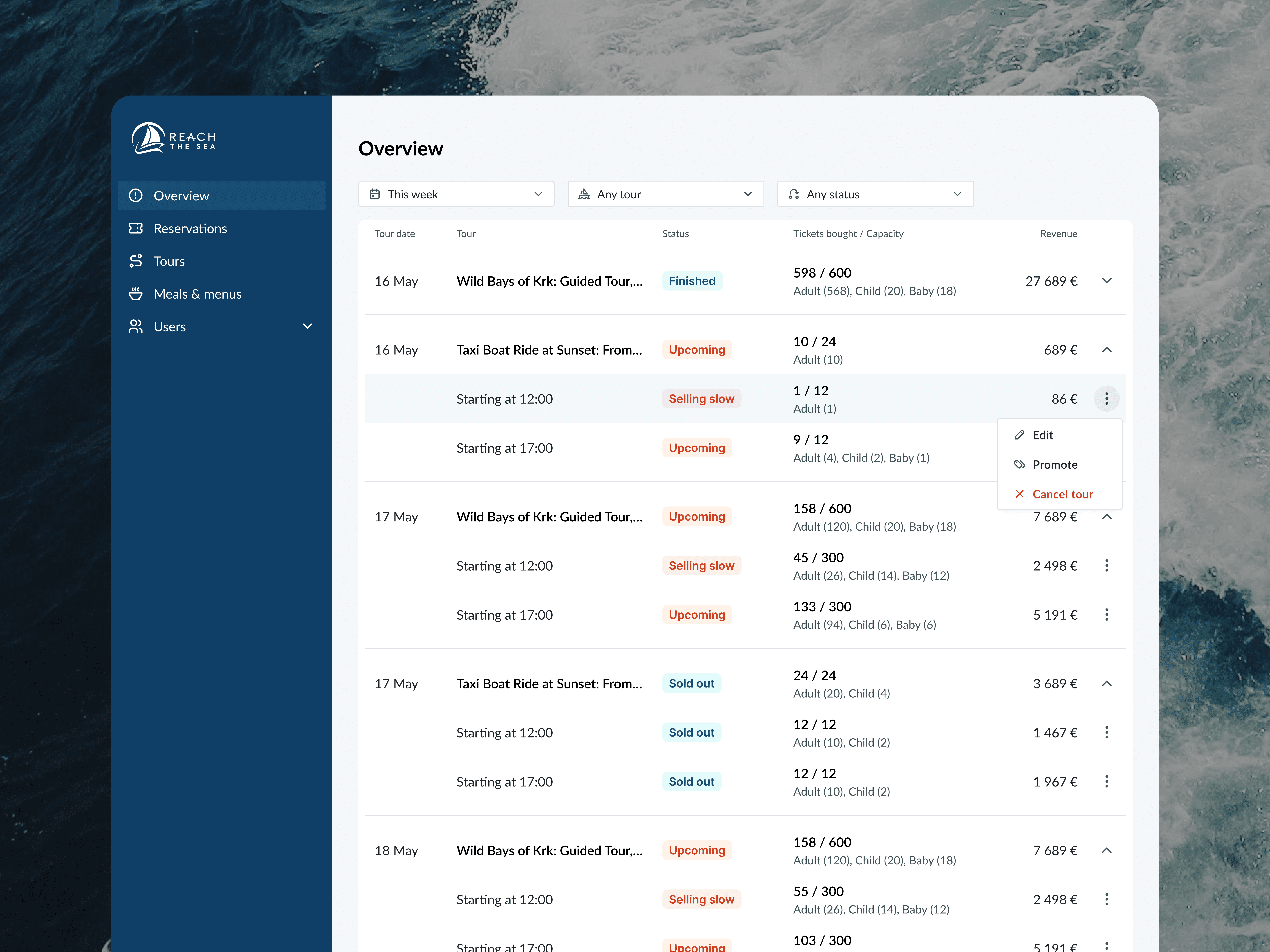 Reach the Sea is a platform that supports boat tour operators by enabling online ticket sales and simple trip management. Sellers can easily manage their rides, view statistics, cancel or reschedule tours, and notify passengers in case of delays or bad weather, while customers can conveniently browse and purchase tickets online.
